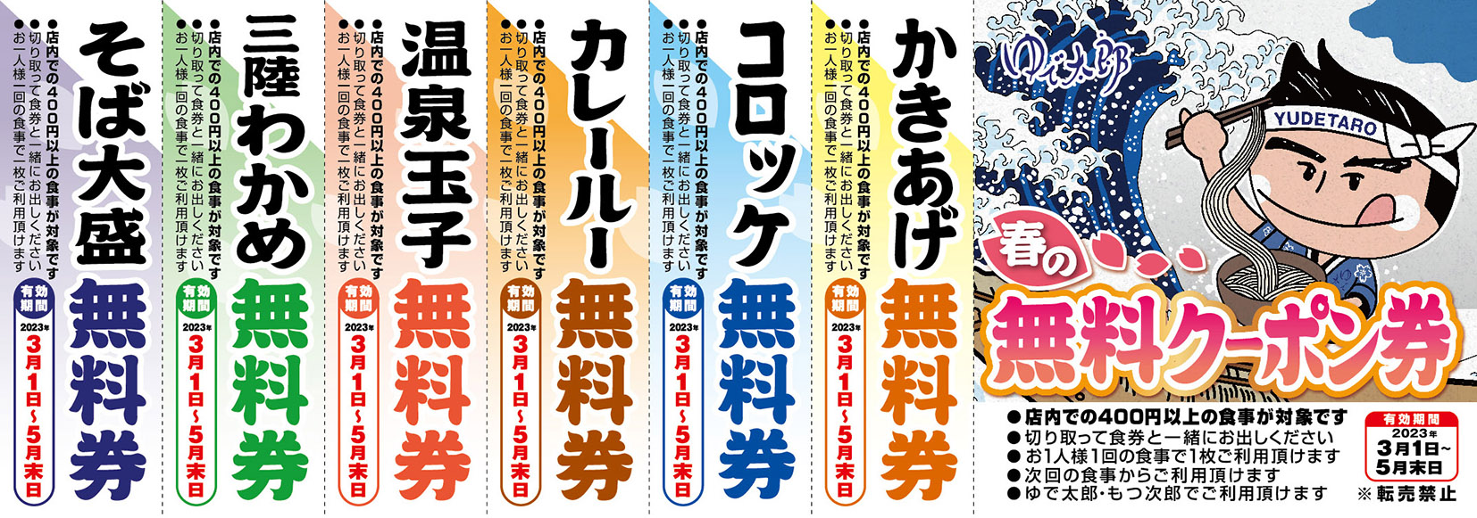 2023年春クーポン!解禁! ゆで太郎 クーポン X Facebook はてブ LINE コピー 2023.02.15 来月から春クーポンになります! 情報解禁! 今回は、かきあげ、コロッケ、カレールー、温泉玉子、三陸わかめ、そば大盛です。 前回と変わらないラインナップです! 配布開始は3/1から!