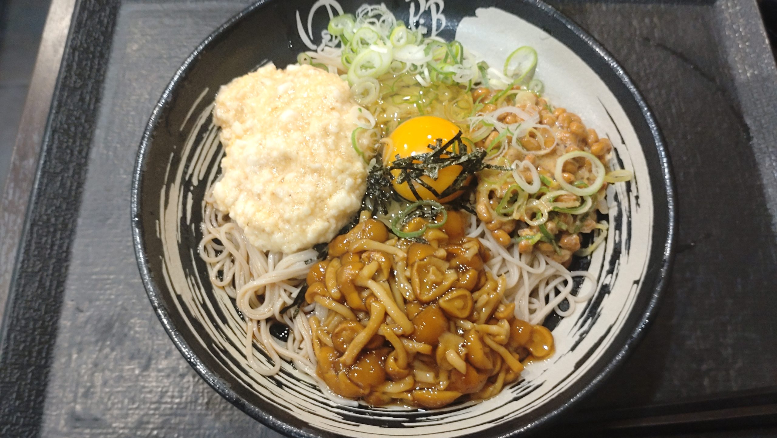 2.月見とろろそばにトッピングでなめこ、納豆を加える