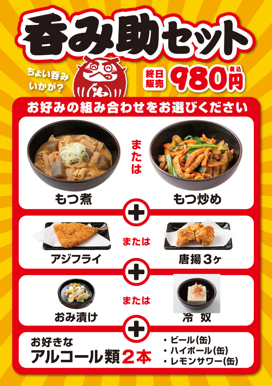 980円という激安価格で、もつ煮orもつ炒め、アジフライorから揚げ、冷奴orおみ漬けとビール、ハイボール、レモンサワーから二本選べます。