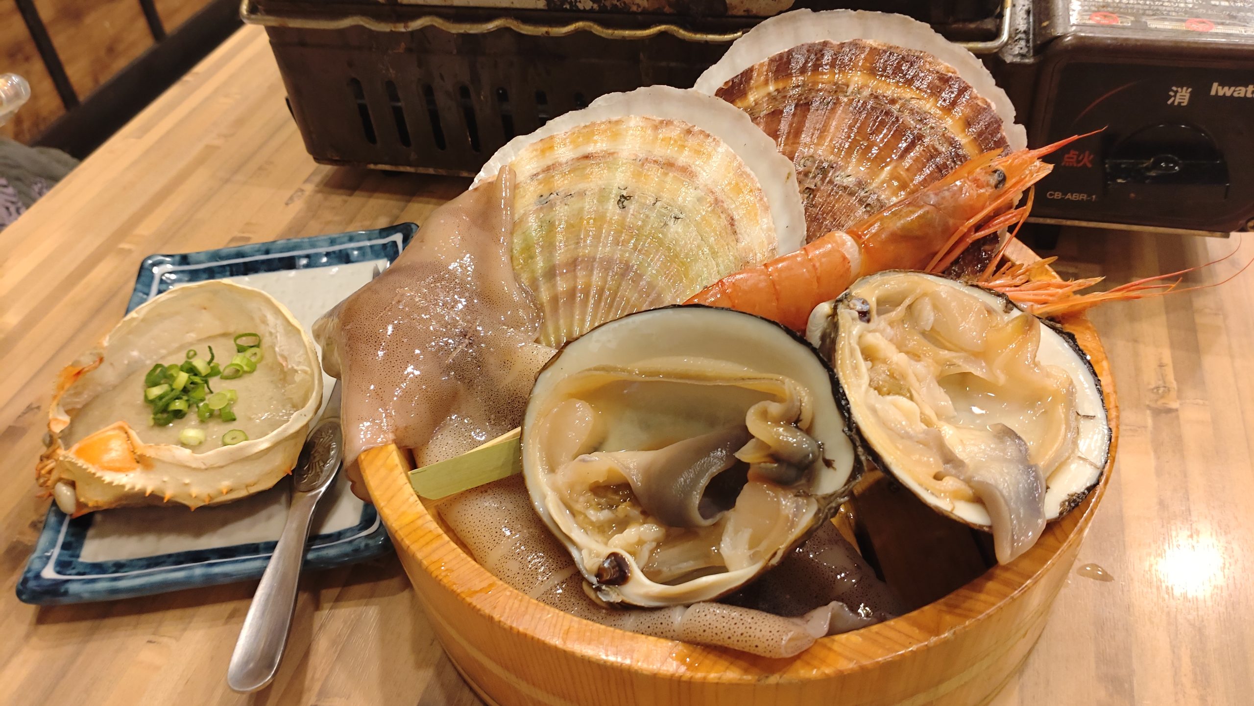 今回はホンビノス貝が無く、ホッキ貝になりましたがホッキ貝2ケ、帆立貝2ケ、海老二本、イカ一杯で1980円はヤバイ。